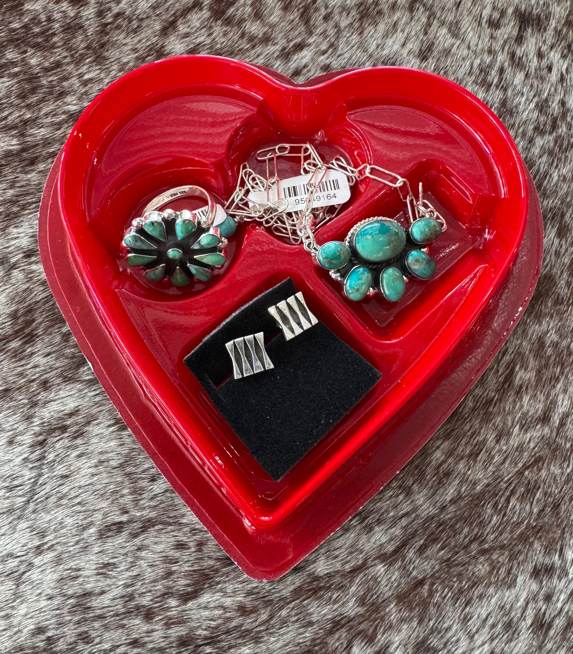 - Bundle includes: half cluster necklace, square silver studs, turquoise circle cluster ring and a mini box of chocolates